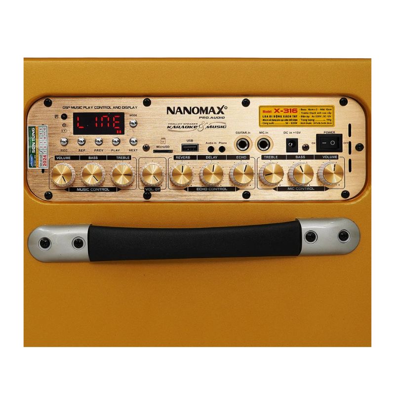 - Thiết kế bắt mắt, gọn gàng và dễ dàng di chuyển: Loa Karaoke di động Nanomax X-316 có thiết kế linh hoạt với kích thước nhỏ gọn 47 x 26.5 x 26.5cm và trọng lượng 11kg. Có một quai xách được tích hợp ở mặt trên loa giúp người dùng dễ dàng di chuyển sản phẩm đến nhiều địa điểm sử dụng. Bên dưới loa được tích hợp thêm 4 chân đế nhỏ giúp cách ly sản phẩm với mặt đất, điều này giúp loa sạch sẽ hơn dù bạn dùng loa ở trong nhà hay ngoài trời. Đồng thời, mặt trên cũng là vị trí của các nút chức năng để người dùng tinh chỉnh một số yếu tố như âm lượng, âm bass, treble, tiếng vang (echo),… sao cho phù hợp với sở thích. Một trong những điểm sáng trong thiết kế của dòng loa này chính là phần logo mới, thùng sơn epoxy vàng sang trọng giúp sản phẩm nổi bật trong không gian. Thân loa Nanomax X-316 bóng mượt mà bền bỉ với màu sắc bắt mắt chính là điểm giúp loa gây ấn tượng với khách hàng ngay từ cái nhìn đầu tiên.