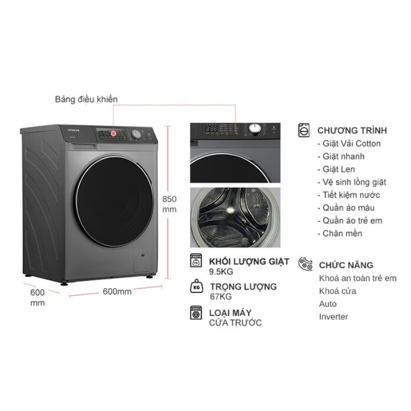 Máy Giặt Hitachi Inverter 9.5 Kg BD-954HVOS cửa trước